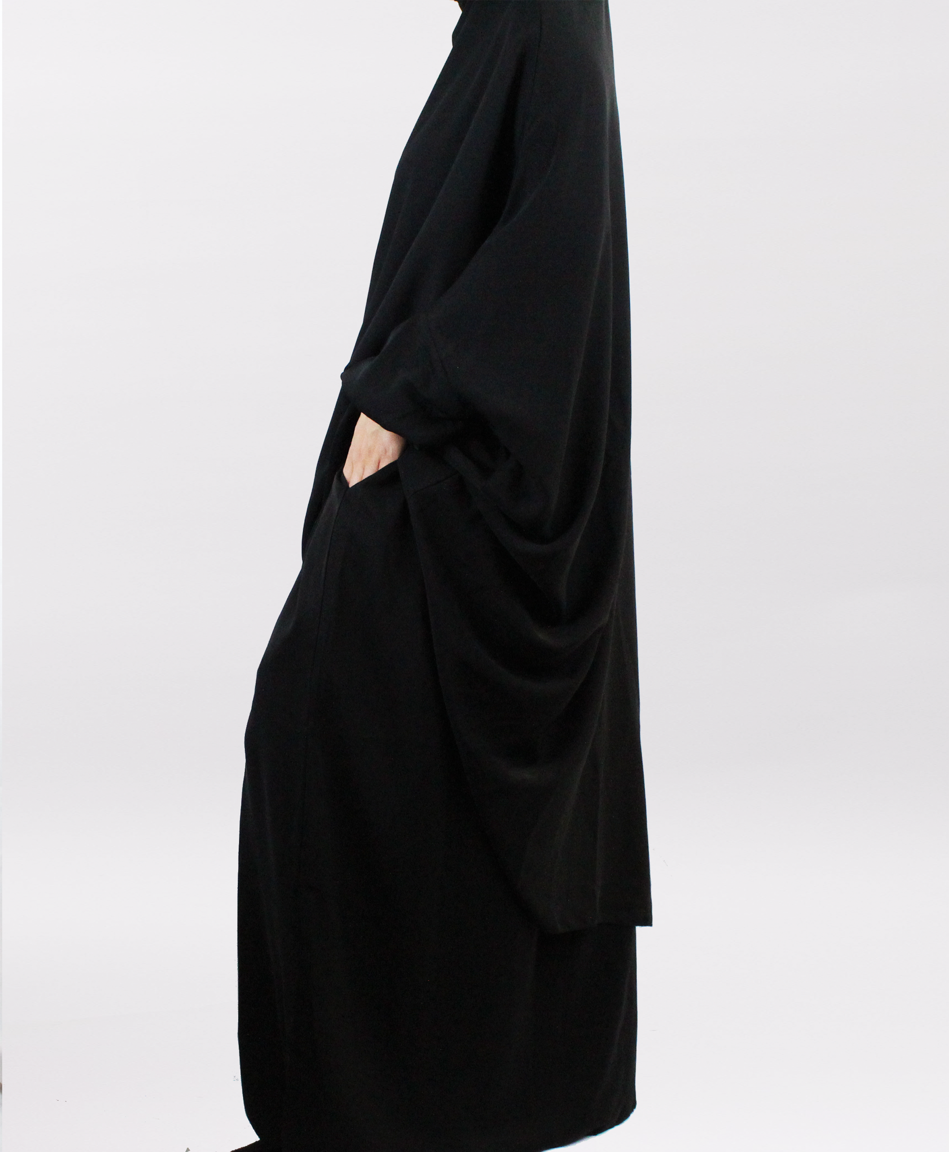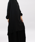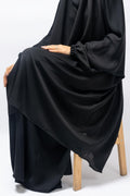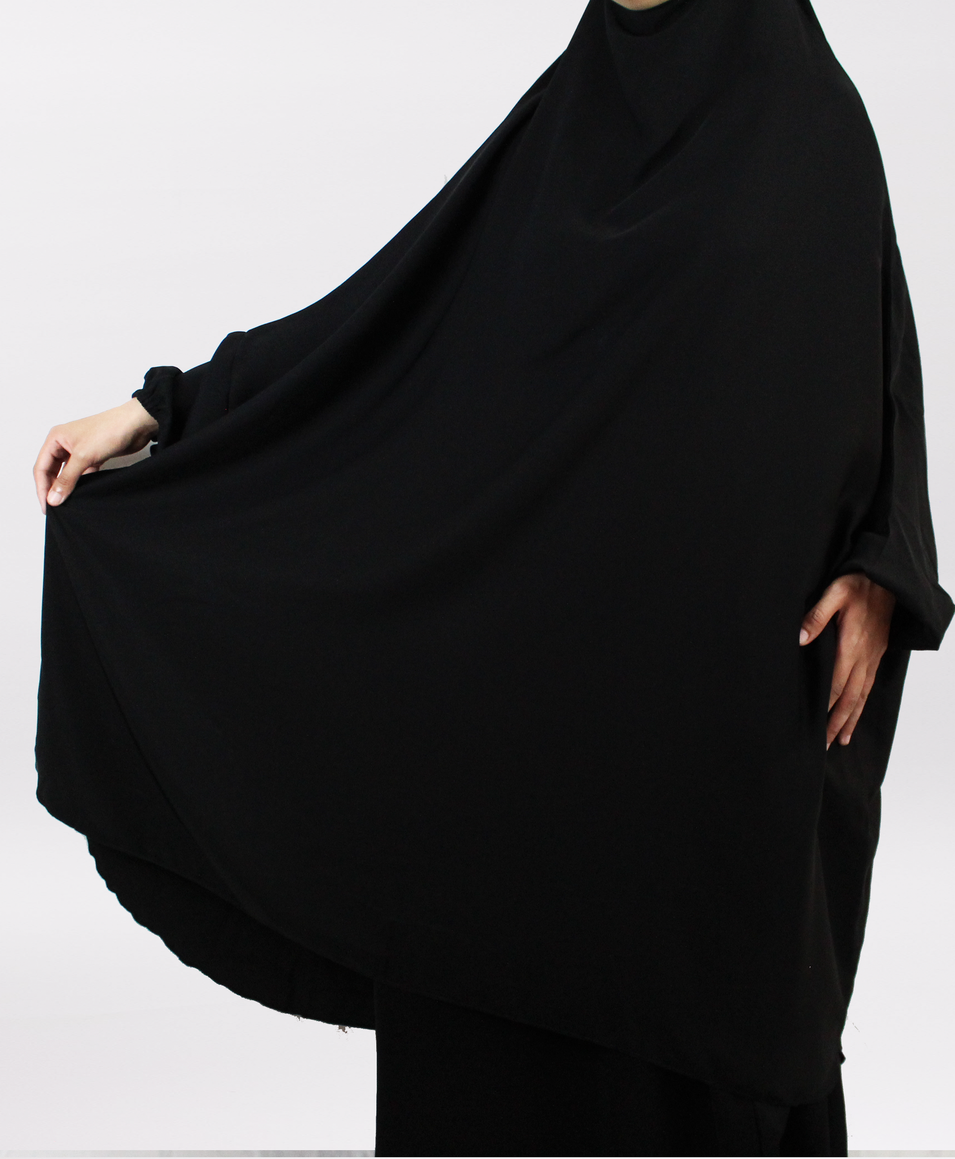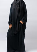 Black 2 piece jilbab with elastic cuffs and a hand-stitched skirt.