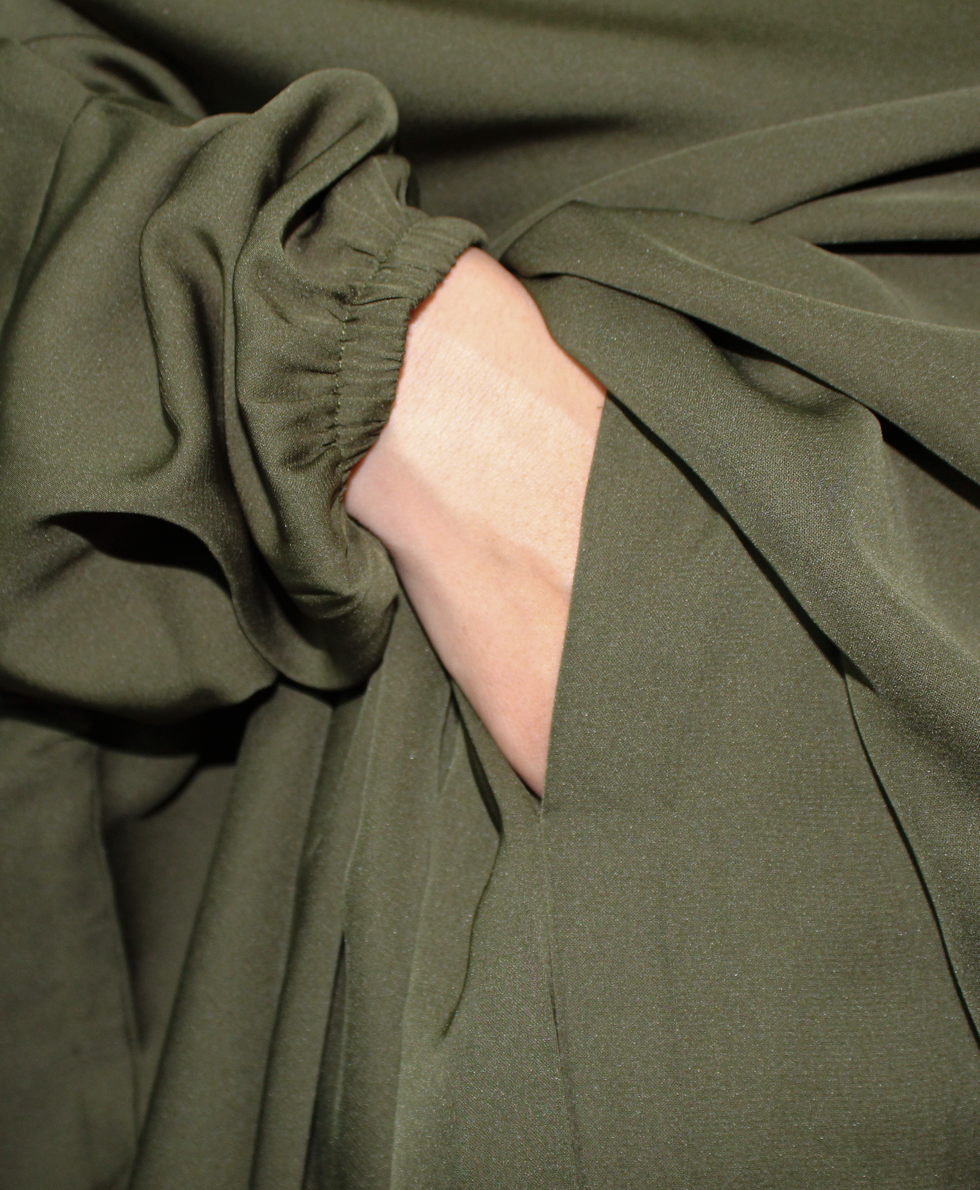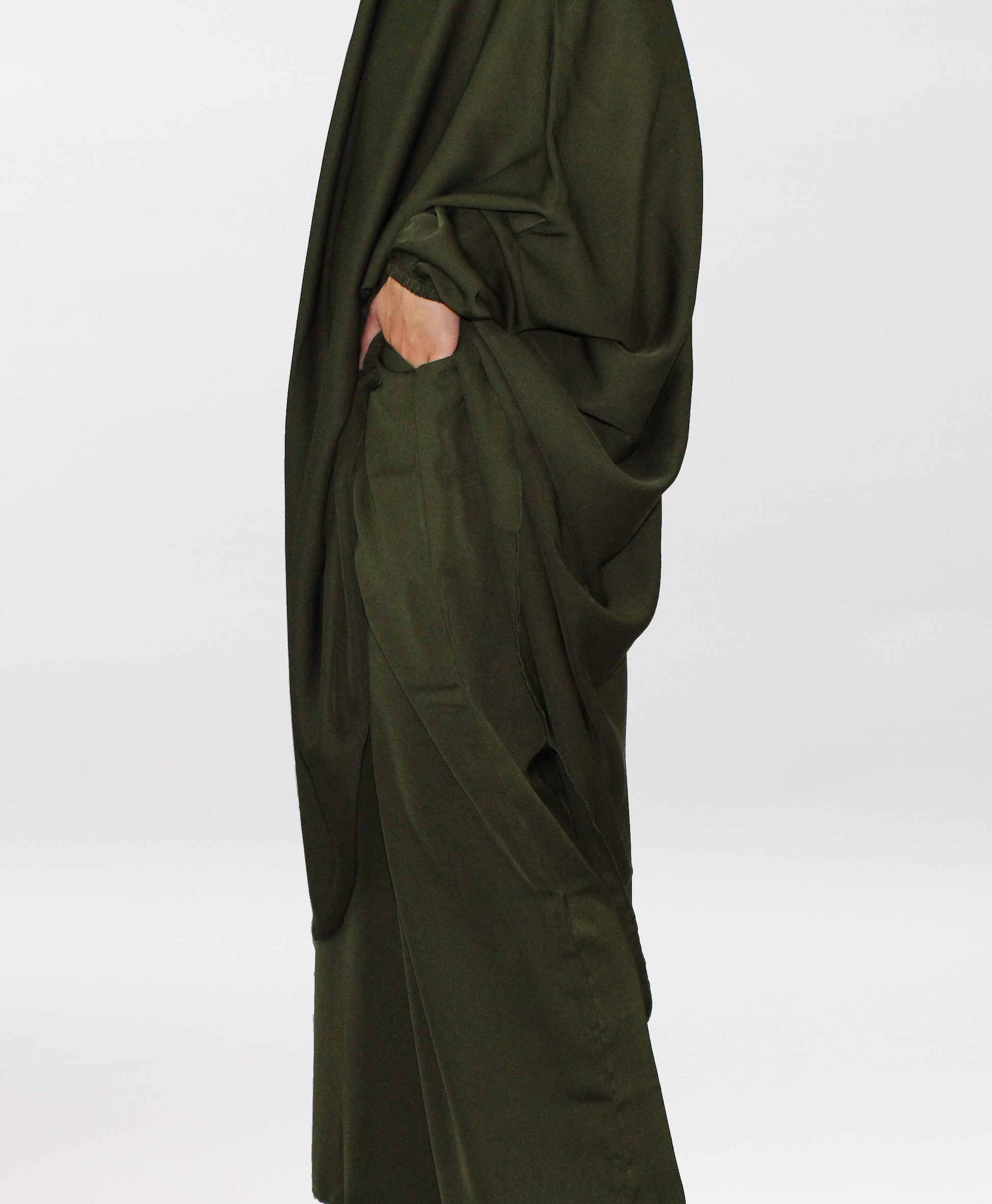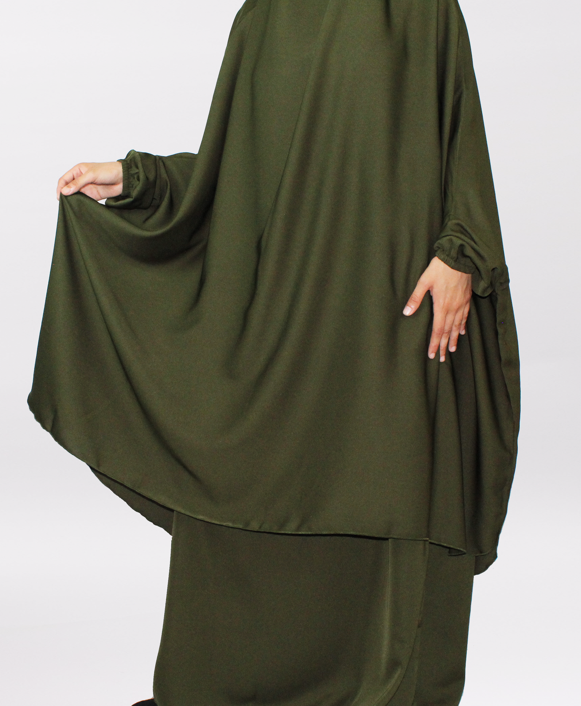 Olive green 2 piece jilbab with elastic cuffs and a hand-stitched skirt.